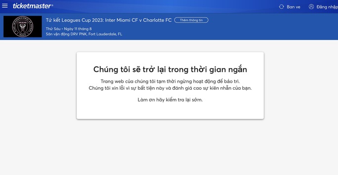 Vé xem trận tứ kết giữa Inter Miami và Charlotte FC tại Leagues Cup đã chính thức mở bán vào chiều thứ 3. Tuy nhiên, sức nóng và ảnh hưởng của Messi đã khiến trang bán vé quá tải và phải bảo trì.
